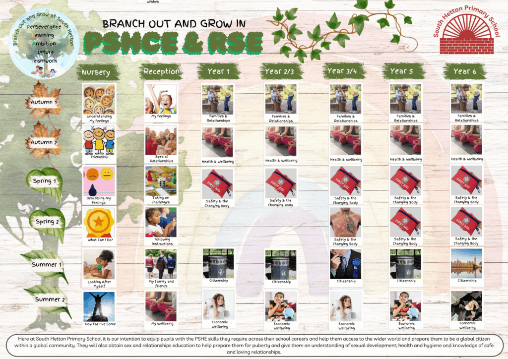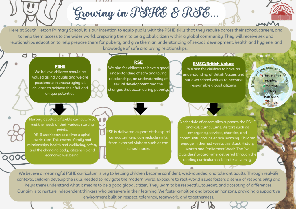 Relationship and sex education at South Hetton Primary School is taught within the personal, social, health and economic (PSHE) education curriculum. Biological aspects are taught within the science curriculum, and some aspects are included in religious education (RE).